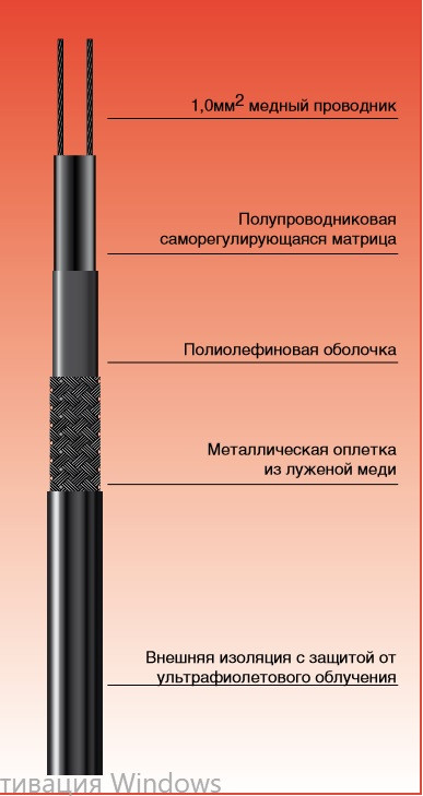 Потужність саморегулювального кабелю 18 Вт/м. за 0 °C (36 Вт/м. у льоду).